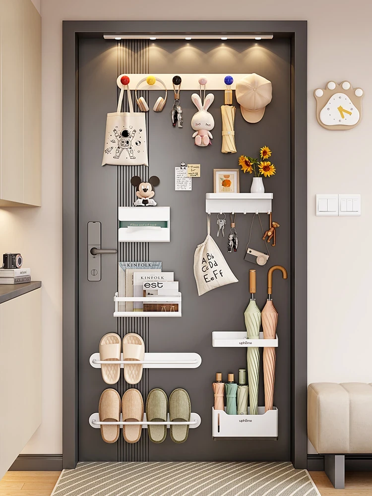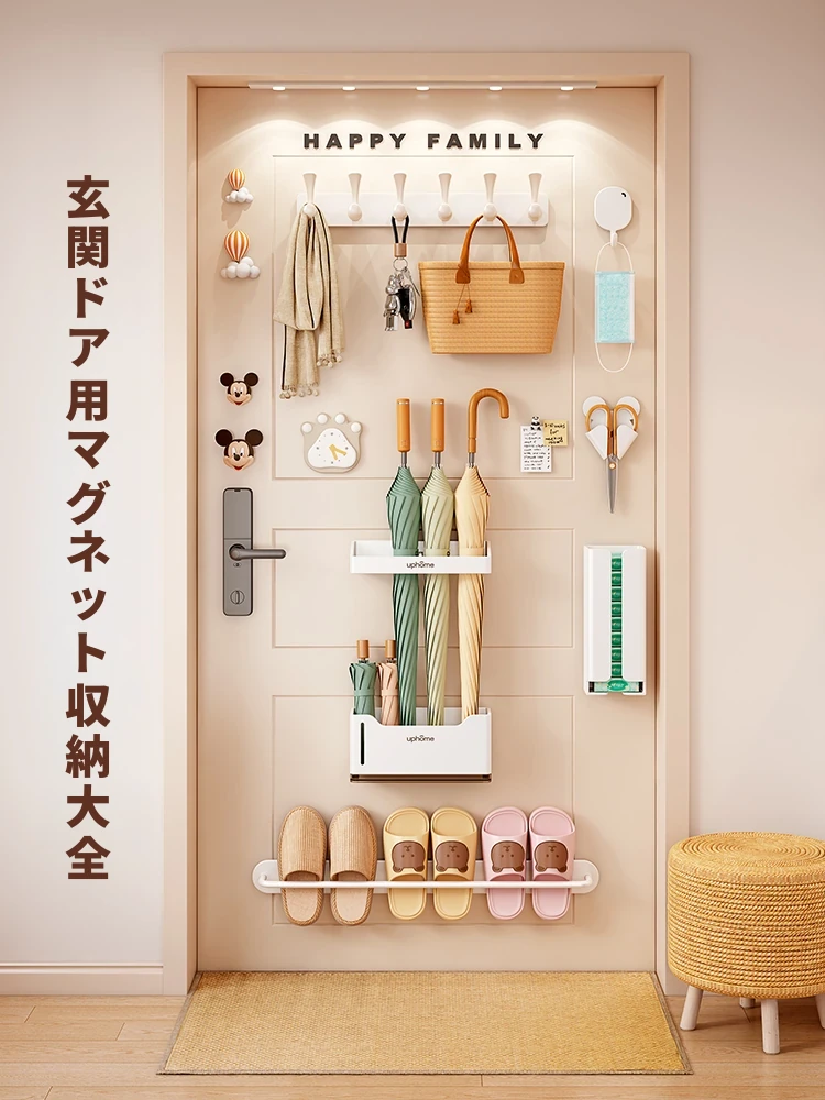 マグネット式壁掛け収納ラック - 玄関のドア後ろにぴったり!鍵やスリッパ、傘をスマートに収納。置き場所を選ばない便利なマグネットセットで、スッキリ整理整頓!